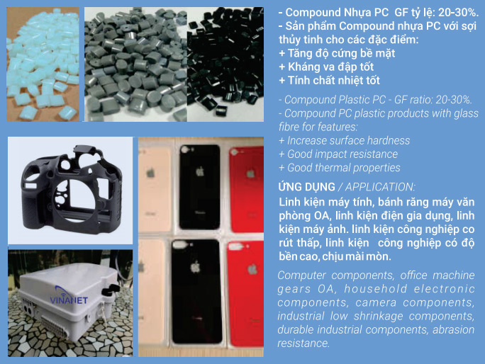 Hạt nhựa PC nguyên sinh là hạt nhựa trong suốt, dộ cứng cao, độ bền cao, chịu được tải trọng lớn trong thời gian dài mà ko biến dạng, chịu va đập. PC gia cường sợi thủy tinh làm tăng độ bền cơ học, độ mài mòn.